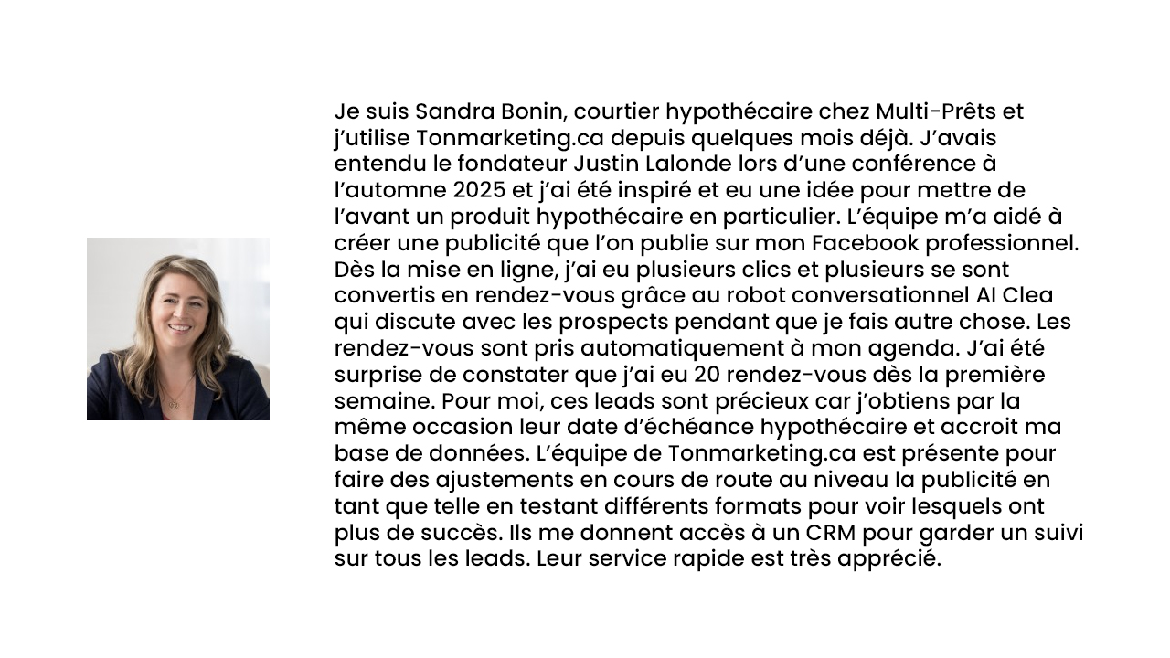 Voici la seule solution marketing 100% automatisée (IA) au Québec qui transforme tes pubs en rendez-vous clients garantis.